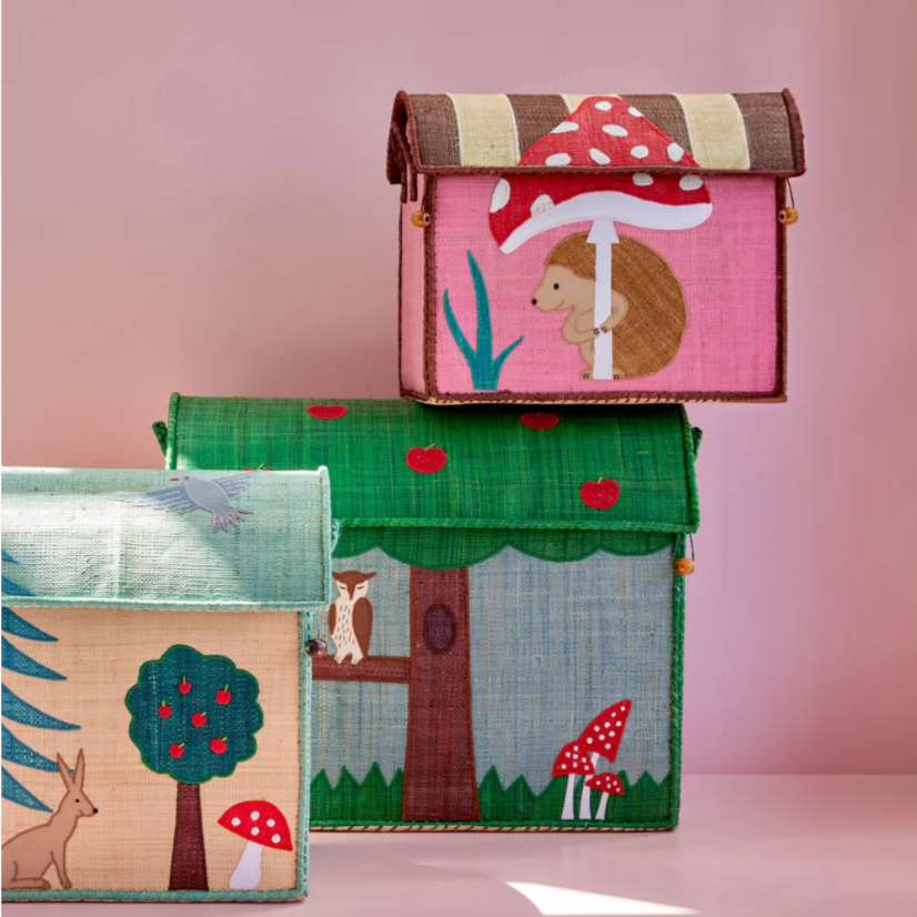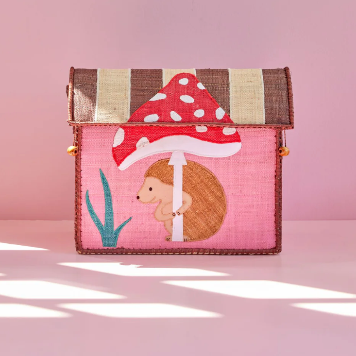 Small-sized raffia storage basket in pink with our cute Happy Forest theme – come meet the forest’s very best friends… a sweet hedgehog and a beautiful, red mushroom. The basket has a practical lid made in a natural and sustainable material. Just perfect for storage in the kids room or the living room where you don't want too much to show.
