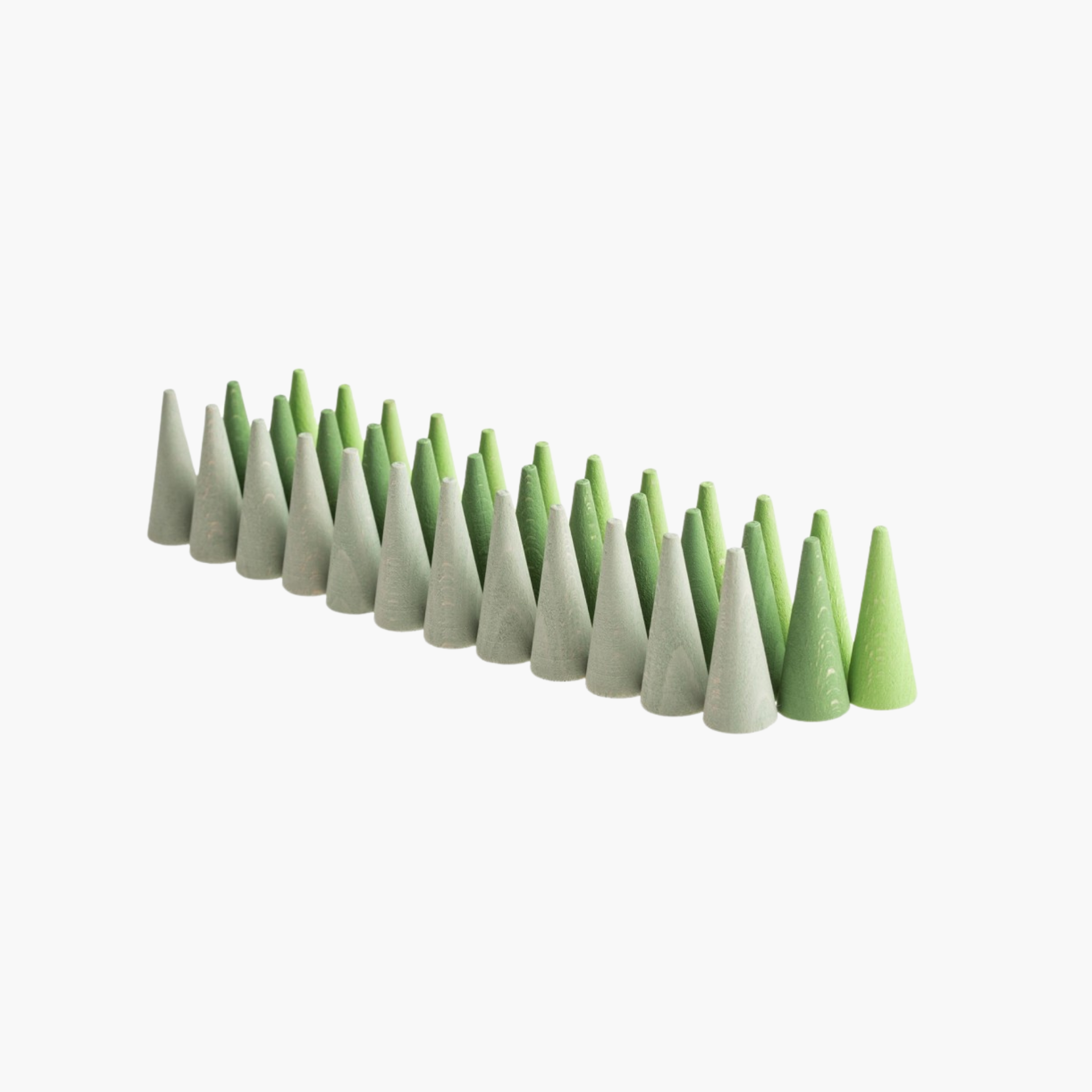 36 cone shaped pieces in green shades for creating mandalas and any other open-ended play