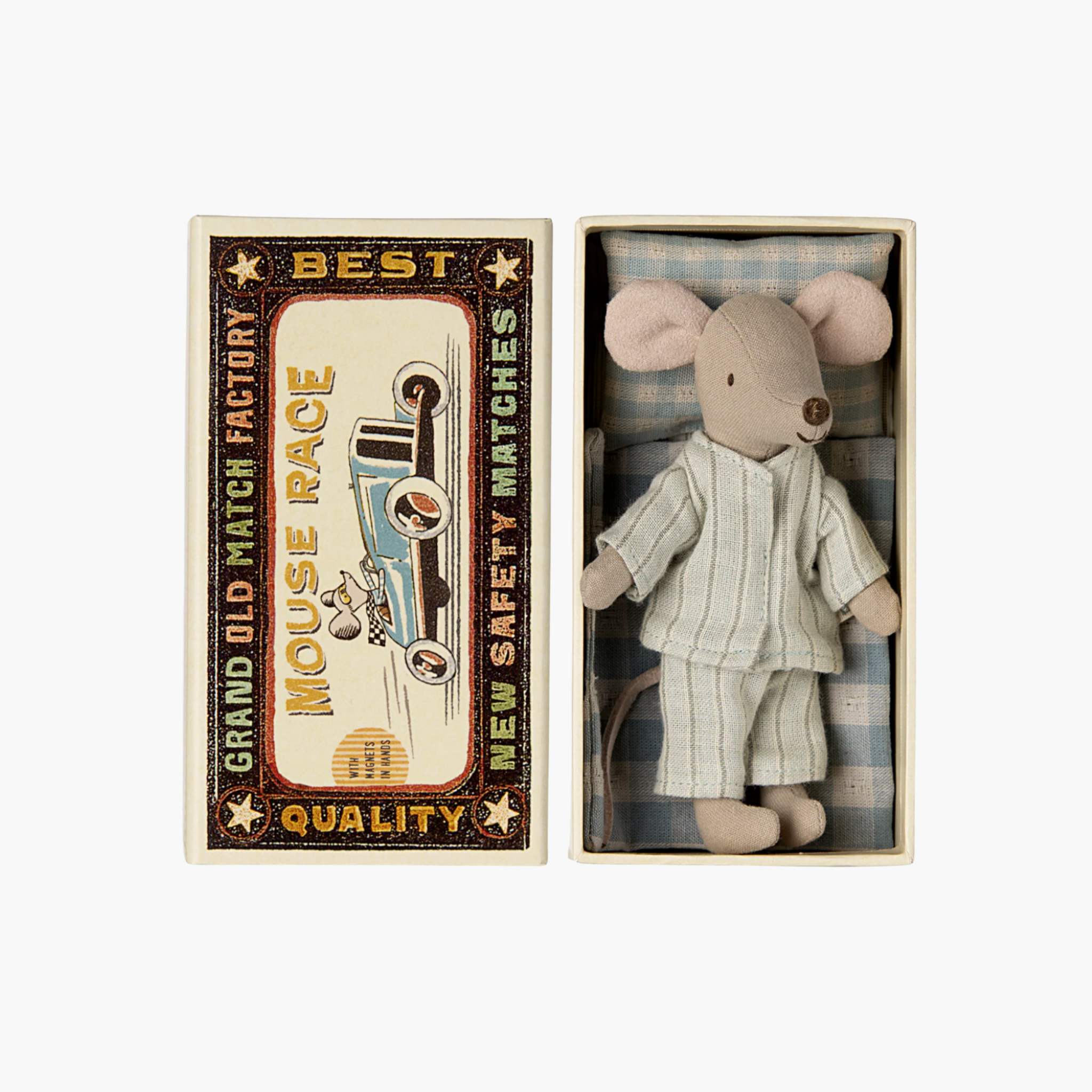 A classic Maileg item, this mouse is ready for hours of play and sleeps soundly in its little matchbox. The clothes and bedding are made of soft fabrics with unique prints in beautiful colors. The mouse has magnets in its hands.