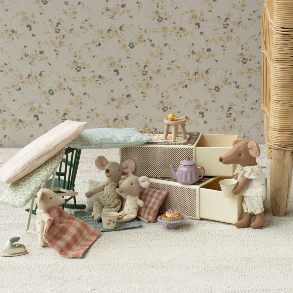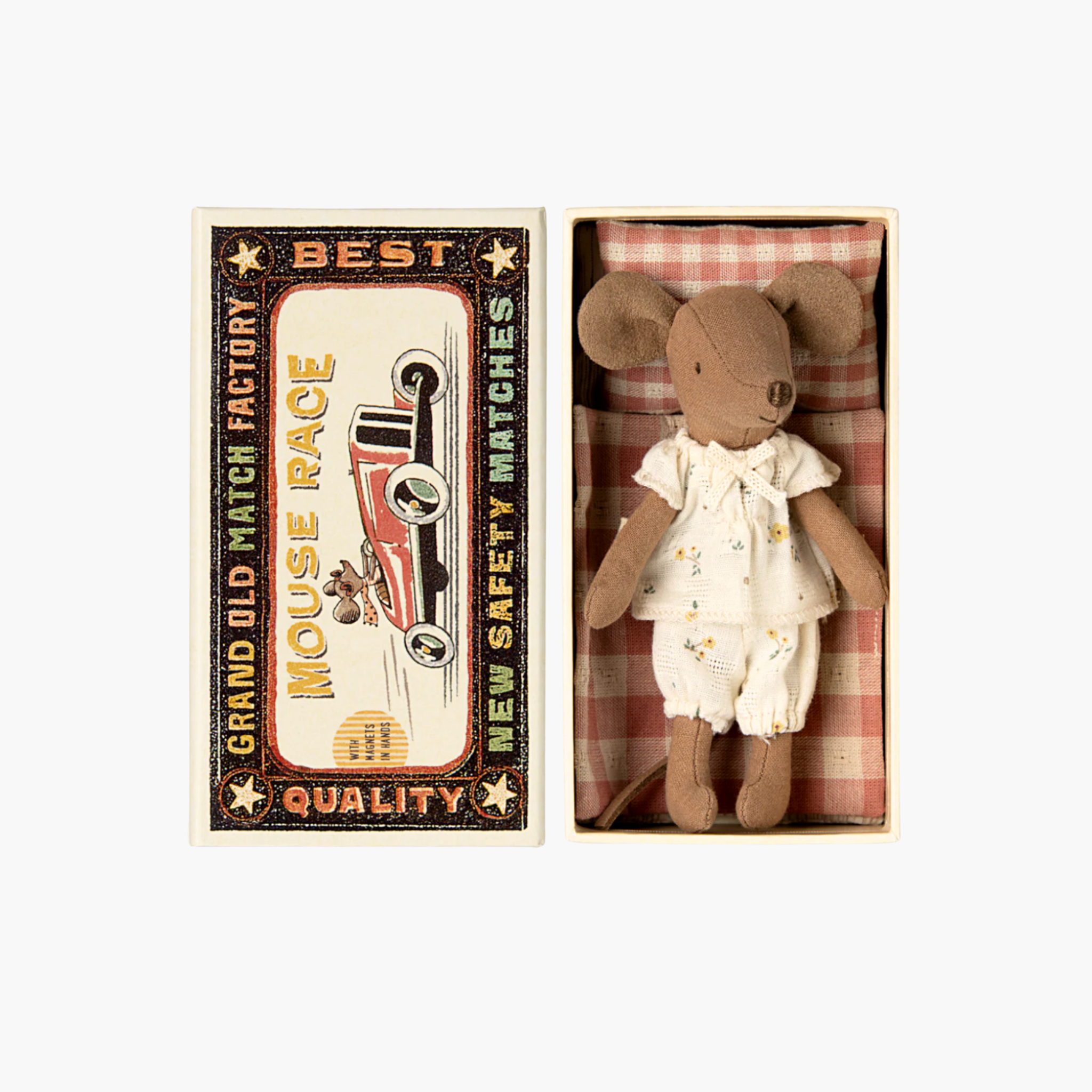 A classic Maileg item, this mouse is ready for hours of play and sleeps soundly in its little matchbox. The clothes and bedding are made of soft fabrics with unique prints in beautiful colors. The mouse has magnets in its hands.
