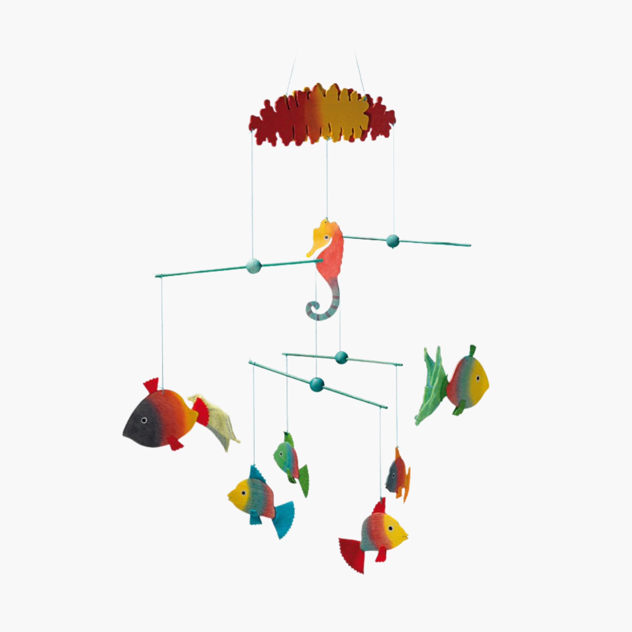 As a playful eye-catcher in the nursery, our beautifully and artistically designed mobiles invite children to dream and relax. Children's and baby mobile "Aquarium". Our decorative wooden mobiles create a harmonious and beautiful atmosphere in the nursery.