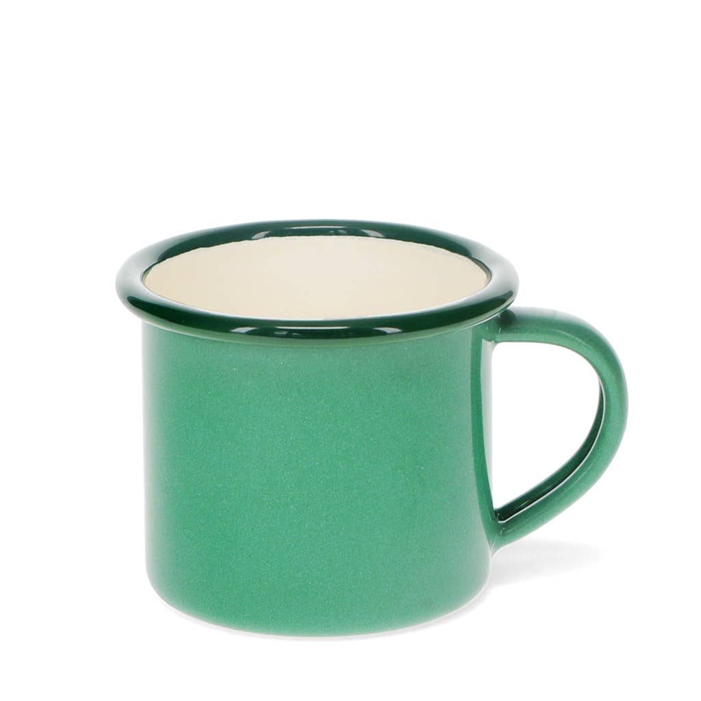 Small enamelware mug with green finish and green rim. It's not only stylish and retro in appearance, making it perfect for a quick espresso indoors at home, but also highly durable – drinks can also be enjoyed outdoors in the garden, or at the campsite.