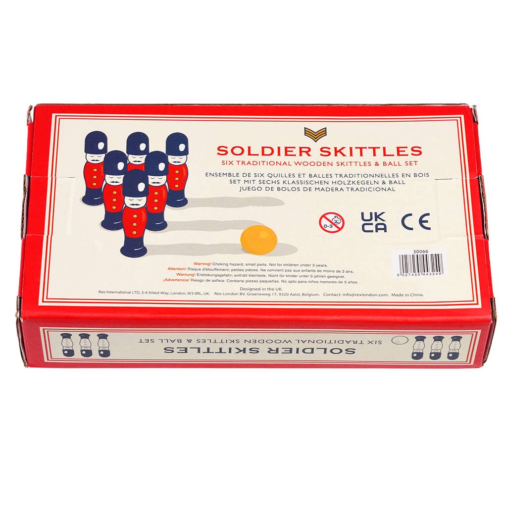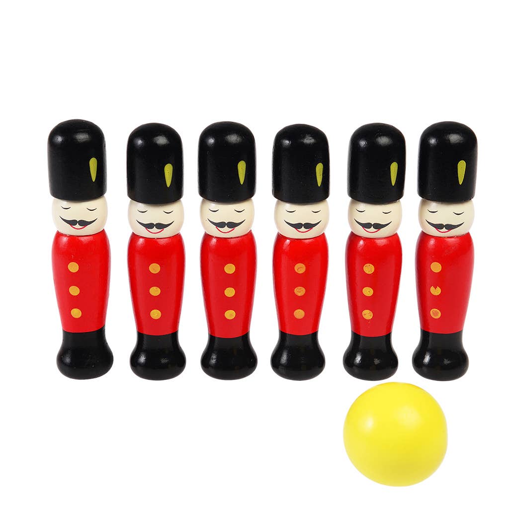A traditional wooden skittle set with six skittles shaped like soldiers and a ball.